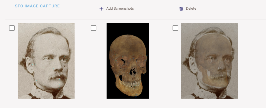 Figure 3. Added screenshots regarding cephalometric, craniometric landmarks and skull-face overlay.